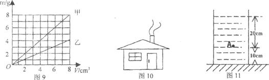 17.小明在探究甲、乙两种不同物质的质最和体积的关系时,得出了如图9所示的图线,由图线可知,甲、乙两种物质的密度之比