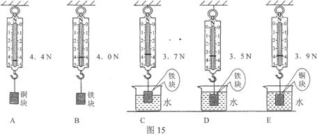 25. 阿基米德原理告诉我们:“浸入液体里的物体受到向上的浮力,浮力的大小等于它排开的液体受到的重力”。小刚在学习了该原理后思考:物体受到浮力的大小难道只跟物体排开液体的重力大小有关吗?于是他猜想:物体受到的浮力大小可能还跟物体的密度和浸入液体中的深度有关。为了验证猜想,他选取了两块体积和形状都相同的实心铜块和铁块进行了如图15所示的实验。