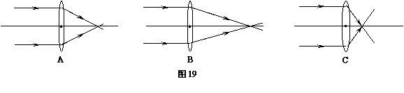 34.小明在学习了凸透镜后,想到了这样一个问题:凸透镜具有会聚作用,如果让平行光通过材料、凹凸程度不同的凸透镜,它们对光线的会聚会有什么不同呢?于是小明在实验室用一束平行光分别经过由两种材料做成的凸透镜A、B、C(其中A和C为同种材料)并得到了如图19所示的光路图: