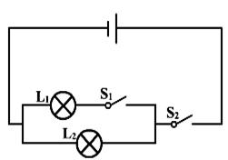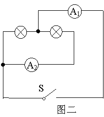 10、图二所示的电路中,两个相同的灯泡连接在电路中,开关S闭合后两灯都亮,电流表A1和A2的读数I1、I2的关系是: ( )