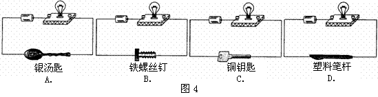 13、如图4所示,用导线把灯泡、电池和下列四种物品分别相连,灯泡不能发光的是