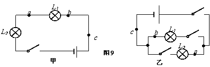 (2) 小明根据图9所示的甲、乙两电路图探究“串联电路和并联电路的电流关系”时,闭合开关后,得到: