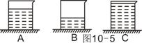 17.三个完全相同的容器,如图10-5所示,将质量相等的水、酒精、硫酸分别装入这三个容器中,根据表中给出的密度值,A、B、C三个容器中依次装的是 、 、 。
