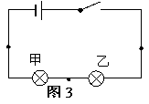 12.如图3,串联在电路里的两盏灯甲和乙,若甲比乙亮,则通过甲灯的电流I甲与通过乙灯的电流I乙的大小相比较是( )![]()