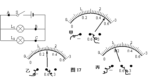 [设计实验]:分别把图17中电路图的A、B、C各点断开,把电流表接入,测量流过的电流,看它们之间有什么关系。