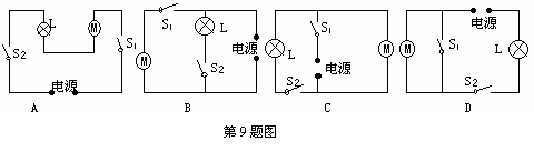 9.家用电冰箱的用电部分主要是电动压缩机和照明灯泡。其中,电动压缩机M受温控开关S1的控制,照明灯泡L受门控开关S2的控制,要求它们既能单独工作又能同时工作。下图中几个同学设计的电路图,其中符合要求的是( )