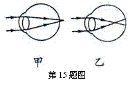 15.全国中学生体质健康调研数据表明:中学生近视发生率约为55.22%,且急剧低龄化。如图所示, (选填“甲”或“乙”)图表示近视眼折光系统的光路示意图,矫正近视眼应佩带 (选填“凸”或“凹”)透镜制成的眼镜片。