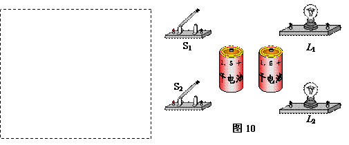 给你两个开关、两个灯泡、两节干电池和若干导线,如图10,设计电路使每个开关只控制一个灯泡,画出电路图,连接实物电路。(5分)