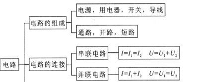 识别方法:(1)电流法:电源正极出发,顺着电流方向依次通过开关、用电器等元件,再回到电源的负极。看电流在流动过程中是否有分流,如果有,就是 电路;如果没有,就是 电路。在图9中,图A是 电路,图B是 电路。(2)节点法:在一个电路中是否存在交叉相连的节点。如果