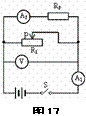 17.变阻器并联型电路变化:如图17所示电路,电源电压不变,闭合开关S,滑动变阻器的滑片P向右移动时,支路R1电阻 ,电流 ,支路R2电流 ,电流表A2的示数 ;干路电流 ,电流表A1的示数 ;电压表V的示数 。