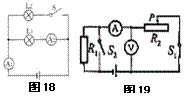 19.综合型电路变化:如图19所示电路,电源两端的电压一定,当开关S1闭合,S2断开时,R1与R2 ,电压表测R2两端电压,当滑动变阻器的滑片P 向右移动时,电压表示数 ,电流表示数 。再闭合S2时,电流表示数 ,电压表示数 。