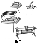 9.实验:如图23所示,闭合开关会看到:(1)金属棒AB 起来,说明通电导体在磁场中会受到 的作用。(2)力的方向:① 跟导体中的 和 有关。②若导体中电流的方向或磁感线的方向有一个改变,则导体的受力方向 ;③若上述两个方向同时改变,则导体的受力方向 。