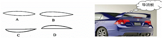 18.如图14所示是有些轿车的尾部安装的导流板。它的作用主要是在轿车高速行驶时,增加对地面的压力,提高车轮的抓地性能。则导流板横截面的形状是 (填A、B、C或D)。其原理为 。
