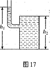 22.如图17所示,放在水平桌面上的容器,侧壁上有一开口弯管,弯管内的液面高度h1=O.8m;容器顶部和底部的面积均为0.1m2,顶部到底部的高度h2=0.6m,容器中的液体密度为1.2×103kg/m3,则液体对容器顶部的压强为 Pa,液体对容器顶部的压力为 N。