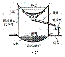 25.我省三明地区有用“地瓜、酒曲、水”做原料酿造“地瓜酒”的习俗。首先将地瓜煮熟,晾到一定的温度后,把“地瓜、酒曲、水”按一定比例混合并搅拌均匀,经发酵40天左右,其间每天搅拌一、二次;最后在“酒料”中分离出“地瓜酒”。图20是从“酒料”中提取“地瓜酒”的装置示意图。