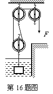 用滑轮组将密度为 2.8×103kg/m3,质量为56kg金属块完全在水中匀速提升0.5m,加在绳子自由端的拉力是F,动滑轮中120N,如图所示。不计绳重及摩擦,g取10N/kg,则下列说法正确的是