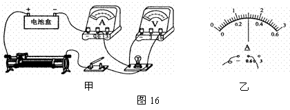 (3)实验时,小雨移动滑动变阻器的滑片,当电压表的示数为3.8V时,电流表的示数如图16乙所示。则该小灯泡的额定电流为_▲_A,额定功率为_▲_W.(4分)
