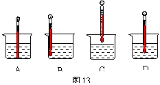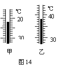 35、使用温度计时,首先要观察它的量程和认清它的________。小强在用温度计测量烧杯中液体温度时读取了四次数据,每次读数时温度计的位置如图13所示,其中正确的是________。图14中所示的是用温度计甲、乙分别测得的冰和水的温度,那么冰的温度是________℃,水的温度是________℃。