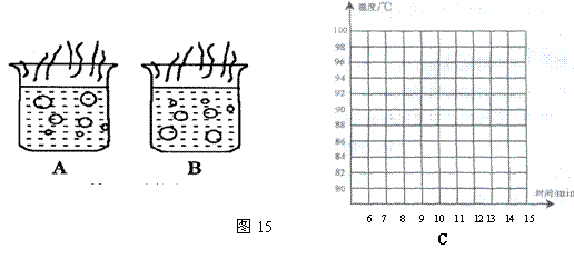 36、在“观察水的沸腾”的实验中,某实验小组观察到水沸腾前和沸腾时水中气泡的上升情况不同,如图15中A、B所示.则图中___________是水在沸腾时的情况,由此可以看出沸腾是一种_____________(选填“剧烈”或“平缓”)的汽化现象.小组记录的实验数据如下表所示: