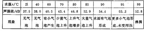 37、俗语说“响水不开,开水不响”,开水真的不响吗?小明想对此进行研究,得到爸爸的支持.小明用圆底铁锅在煤气灶上进行烧水试验,用温度计、数字声级计(测量声音强弱的仪器)分别测量锅内水的温度、锅旁声音的强弱。测量结果如下表: