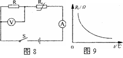如图8所示电路中,R是一个定值电阻,Rl是一个半导体材料制成的热敏电阻,其阻值随温度变化的曲线如图9所示,当开关闭合且电阻Rt所处的环境温度升高时,电流表示数______,电压表示数______。(填“增大”、“减小”或“不变”)