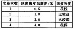 在学习势能知识时,小宇同学猜想物体的重力势能的大小可能与以下三个因素有关:①物体高度,②物体质量大小,③物体所处地理位置。为了证明自己的猜想,首先决定对因素①进行验证。他把橡皮泥平铺在水平面上,让1个小球从不同高度自由下落,记录结果如右表所示。