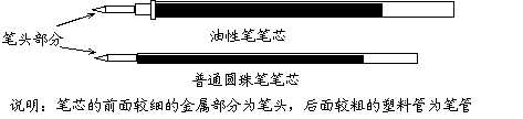 选用身边的器材探究轮轴的特点完成实验,如:圆珠笔芯(可以选用油性笔笔芯或普通圆珠笔笔芯,如图所示),若手头没有圆珠笔芯也可以选用其它一头粗一头细的笔代替。该实验不考虑摩擦力不同对结果的影响。