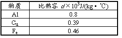 电视机、家用音箱功放、电脑在工作中会产生较多的热量,为了将热量尽快散出,通常会使用金属散热器来散热,散热器要在短时间内尽可能多的吸收所产生的热量(即有较大的热容量)现有Cu、Fe、Al三种材料供选择(部分数据见表),你认为散热器选哪种材料最好