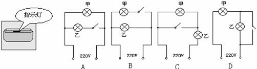 11.如图所示,家庭照明灯的一种按键开关上常有一个指示灯。在实际使用中发现:当开关闭合时,只有照明灯发光;开关断开时,照明灯熄灭,指示灯会发出微弱光,以便夜间显示开关的位置。根据这种按键开关的控制特性,能正确表示照明灯(甲)和指示灯(乙)连接方式的电路图是图中的 ( )