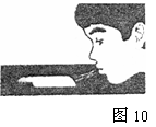 (2)如图10所示,把一张半卷着的硬纸片摆放在桌子上,如果使劲吹一下它的下面,可以发现硬纸片不会翻转过去。这是因为流体的压强与流体流动的