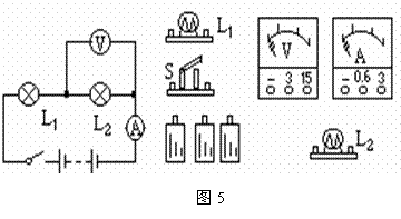 用如图5的器材,根据电路图,用铅笔画线代替导线连接实物图(电流表用0.6A量程,电压表用3V量程)。
