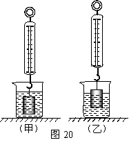 底面积为100cm2的烧杯中装有适量水。当金属块浸没在水中静止时,如图20(甲)所示,弹簧测力计的示数F1=3.4N,水对杯底的压强为p1;当金属块总体积的1/4露出水面静止时,如图20(乙)所示,弹簧测力计的示数为F2,水对杯底的压强为p2;若p1、p2之差为50Pa,g取10N/kg。求: