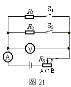 图21所示电路中,当只闭合开关S1,且滑片P在滑动变阻器的B端时,电流表的示数为0.2A,电压表的示数为U1,滑动变阻器R3消耗的电功率为P3;当只闭合开关S2,且滑片P在滑动变阻器的中点C时,电压表的示数为U2,滑动变阻器消耗的电功率为P3′,此时R2消耗的电功率为2.4W。已知U1∶U2=1∶2,P3∶P3′=2∶1,电源两端电压保持不变。求: