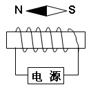 (2分)螺线管通电后,小磁针静止时指向如图所示,请在图中标出通电螺线管的N、S极,并标出电源的正、负极。