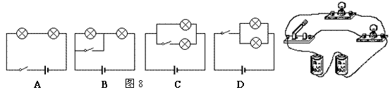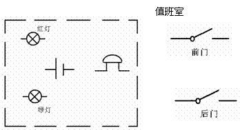 19、某工厂的值班室有红绿灯各一个,电铃一个,电池组和若干导线,工厂的前后门各有一个踏板式的开关。请利用这些材料设计一个实用的电路。要求当前门有人进来时,踏中踏板则红灯亮,电铃响;后门有人进来时,踏中踏板则绿灯亮,同时铃响。