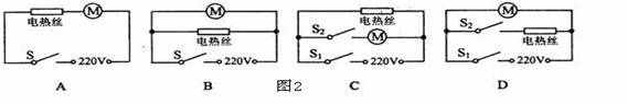 2. 家用电吹风由电动机和电热丝等组成.为了保证电吹风的安全使用,要求:电动机不工作时,电热丝不能发热:电热丝不发热时,电动机仍能工作.下列电路中符合要求的是: