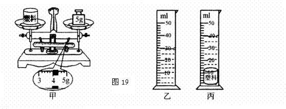 24.小芳用天平测一块实心塑料块的质量,天平平衡后如图19甲所示,再把塑料块放入装有酒精的量筒,量筒在塑料块放入前、后的液面分别如图19乙、丙所示.由此可知塑料块的质量是_____g,体积是_______cm3,这种塑料的密度是________kg/m3.