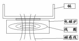 如图所示是描述电磁炉的原理示意图。炉子的内部有一个金属线圈,当电流通过线圈时会产生磁场,这个磁场的大小和方向是不断变化的,这个变化的磁场又会引起在电磁炉上面的铁质锅底内产生感应电流,感应电流又会在锅底产生热量,这些热量便能起到加热物体的作用。
