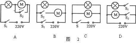 4.一般家庭的卫生间都要安装照明灯和换气扇。使用时,需要它们都能各自独立工作.在图2所示的电路中,你认为符合上述要求的是:![]()