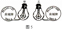 甲、乙两只普通照明灯泡的铭牌如图5所示,若二灯灯丝一样粗,则 灯的灯丝更长些。若把两灯串联接在220V的电路中,则 灯较亮些。若把它们并联接在110V的电路中,则 灯实际消耗的功率较大些。![]()