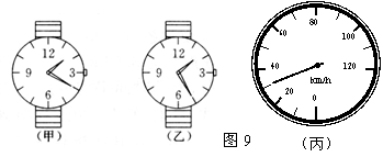 坐在行驶的汽车上的一名乘客,想估测前方隧道的长度。他在进、出隧道口时,分别看了一下手表,如图9甲、乙所示,他留意到通过隧道时,汽车速度计的指针一直停在图丙所示的位置。由此可知汽车通过隧道所用时间为 ,汽车作_____运动,速度大小为______,此隧道长约_____km。