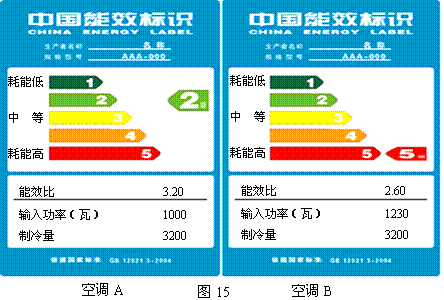21.我国对家用电冰箱、空调这两个产品率先实施能源效率标识制度,如图15所示。能效标识将能效分为五个等级,等级1表示产品最节能,等级5是市场准入指标,低于该等级要求的产品不允许生产和销售.