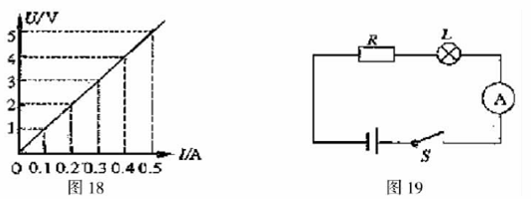 20.(7分)图18是电阻R的电流与电压的关系图像,把该电阻与阻值是20Ω的小灯泡L串联