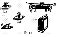 19.图13给出了几种元件,要求:L1与L2并联,且滑动变阻器控制通过L1的电流,S是总开关。请用笔画线代替导线,把它们连接起来。并在右边方框内画出它的电路图。