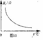 20. 如图9所示电路中,R是一个定值电阻,Rt是一个半导体材料制成的热敏电阻,其阻值随温度变化的曲线如图10所示,当开关闭合且电阻Rt所处的环境温度升高时,Rt的电阻值______,电流表示数______,电压表示数______。(填“增大”、“减小”或“不变”)