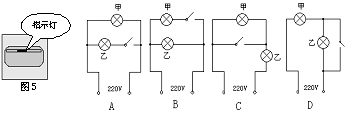 如图5所示,家庭照明灯的一种按键开关上常有一个指示灯。在实际使用中发现:当开关闭合时,只有照明灯发光;开关断开时,照明灯熄灭,指示灯会发出微弱光,以便夜间显示开关的位置。根据这种按键开关的控制特性,能正确表示照明灯(甲)和指示灯(乙)连接方式的电路图是图6中的(