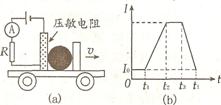 小敏利用“压敏电阻的阻值随所受压力的增大而减小”的性质,设计了判断物体运动状态的装置。其工作原理如图(a)所示,电源、电流表、定值电阻和压敏电阻由导线连接成一个串联电路,压敏电阻和一块挡板固定在绝缘小车上,中间放置一个可活动的绝缘球,压敏电阻不受力时,电流表示数为厶,小车运动状态变化会引起电流表示数变化。如图(b)所示是某次小车向右作直线运动时电流随时间变化图象。下列有关该次小车运动状态的判断正确的是