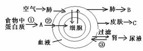 (6分)右图是人体部分新陈代谢过程的示意图,请根据图示回答下列问题: