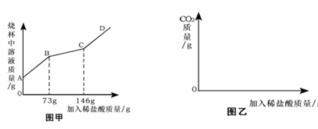 (1)请你根据图甲提供的信息,在图乙的坐标系中画出检测过程中产生CO2的质量随滴加盐酸质量的变化曲线(注意标明二氧化碳、盐酸质量的相应数值)。