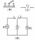 (7分)如图所示,(甲)是一单刀双掷开关的实物图,它的符号如图(乙)所示。图(丙)是单刀双掷开关的电路控制作用的一个实例。当S与“1”接触时,灯泡E1发光,当S接触“2”时,灯泡E2发光。现有如下器材:一个电源(两极间电压保持不变,但电压数值未知) 一个电阻箱(用R0表示)